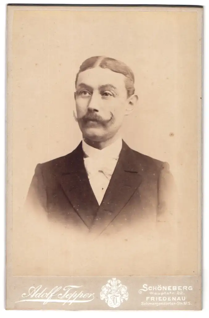 Fotografie Adolf Tepper, Schöneberg, Hauptstr. 22, Porträt eines Herrn mit markantem Schnurrbart