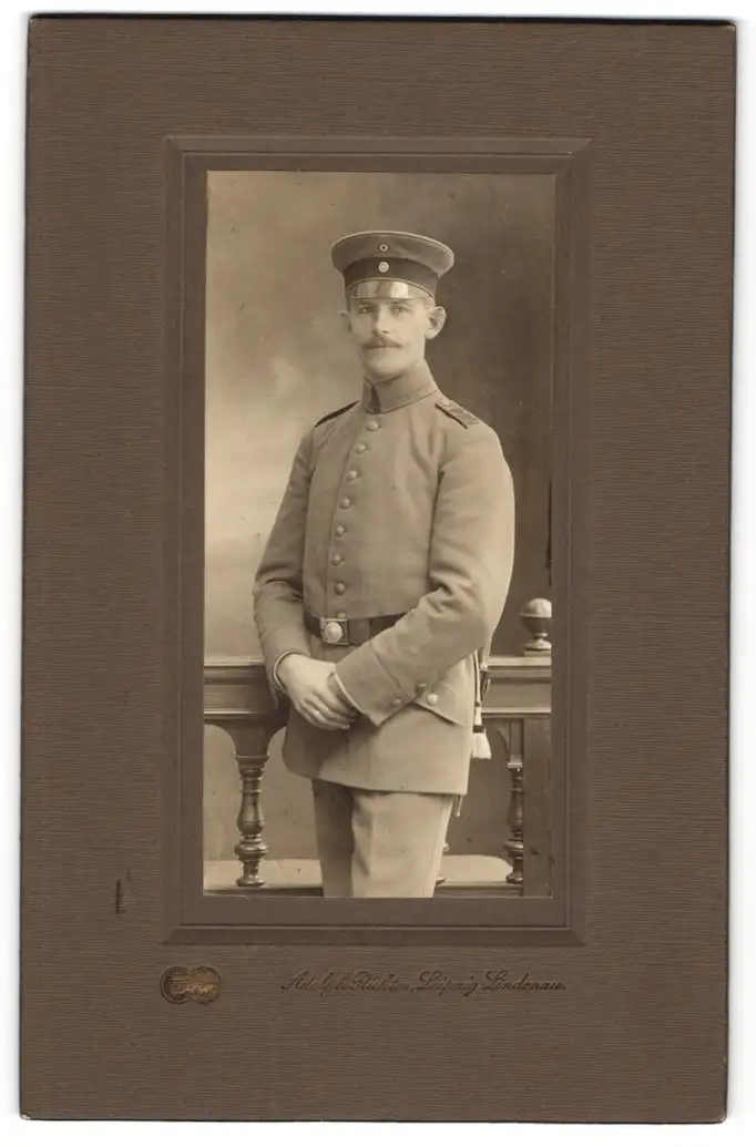 Fotografie Adolph Richter, Leipzig, Gutsmuths Str. 17, Soldat in Uniform mit Schirmmütze u. Oberlippenbart