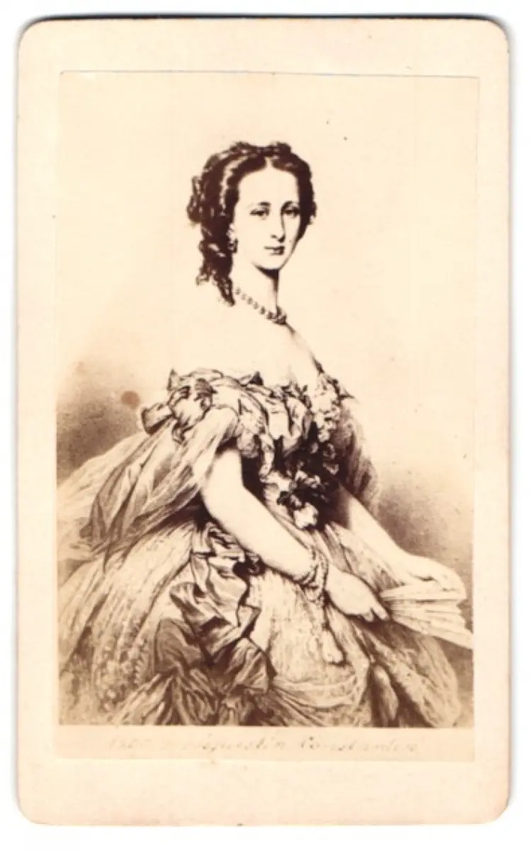 Diese CDV Fotografie zeigt eine elegante Dame in einem atemberaubenden, kunstvoll drapierten Kleid aus feinem Stoff. Die voluminösen Ärmel und die detaillierte Verzierung mit floralen Elementen verleihen dem Kleid eine opulente Ausstrahlung. Der zarte Fächer in ihrer Hand und die sorgfältig gestylte Frisur unterstreichen die Anmut und den Stil der abgebildeten Person., guter Zustand