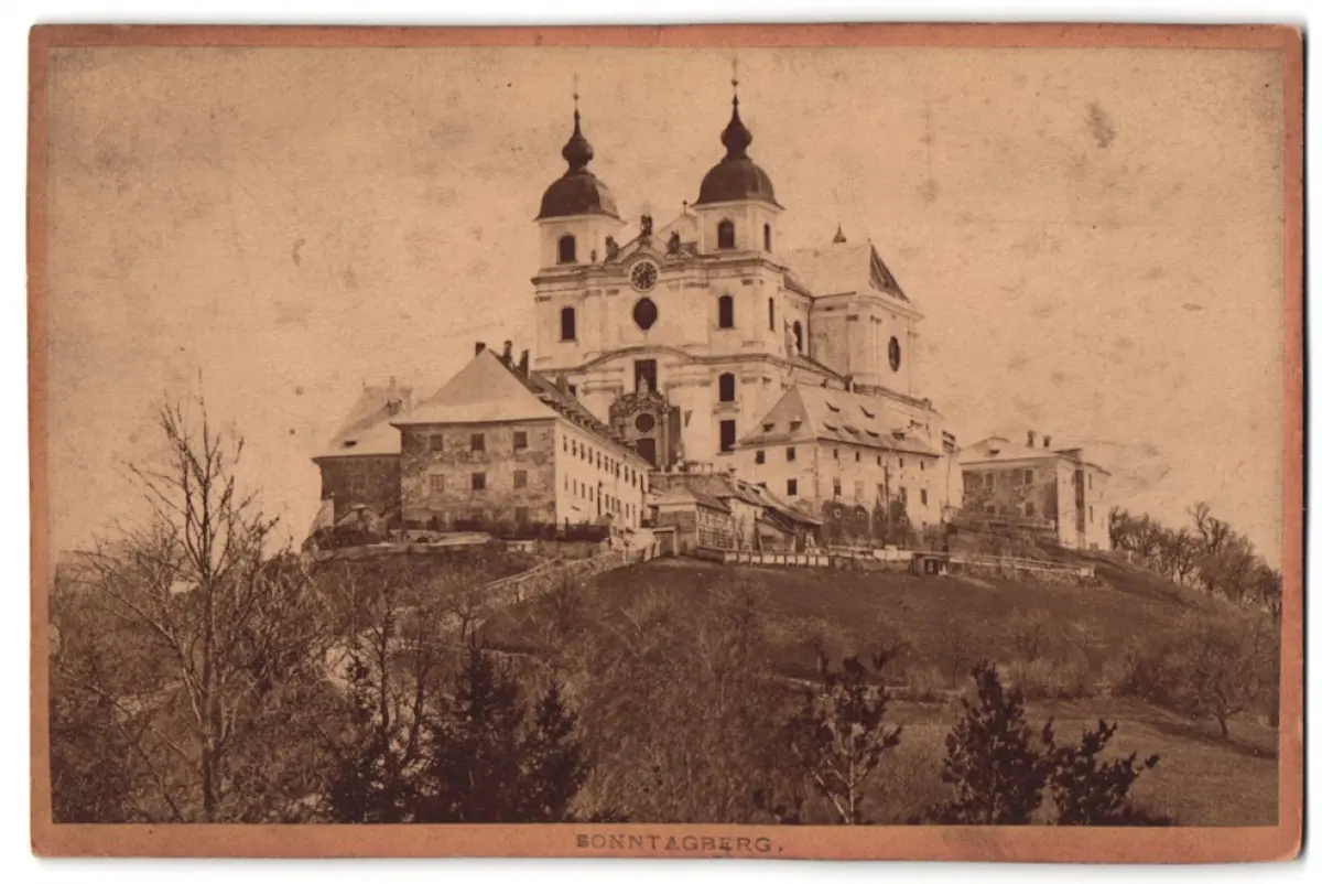 Diese Kabinettfotografie fängt die beeindruckende Fassade der majestätischen Basilika auf dem Sonntagberg ein. Das Bauwerk thront erhaben auf dem Hügel und zeigt eine grandiose Architektur mit seinen markanten Kuppeln und Türmen. Umgeben von einer sanften Hügellandschaft, strahlt die Kirche eine zeitlose Ruhe aus. Die umgebenden Bäume und der klare Himmel verstärken den eindrucksvollen Anblick dieses historischen Bauwerks., guter Zustand