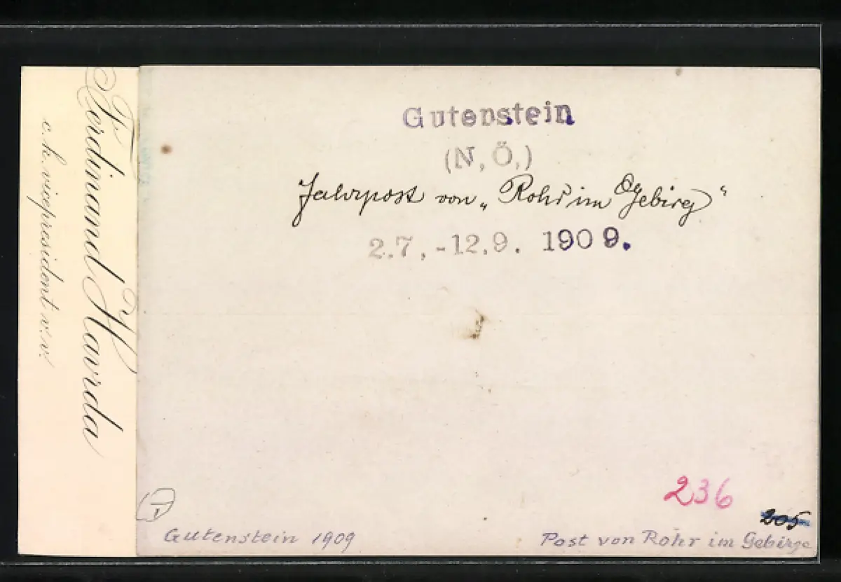 Fotografie Ansicht Gutenstein / N.Ö., Partie im Ort mit Postkutsche von Rohr im Gebirge, 1909