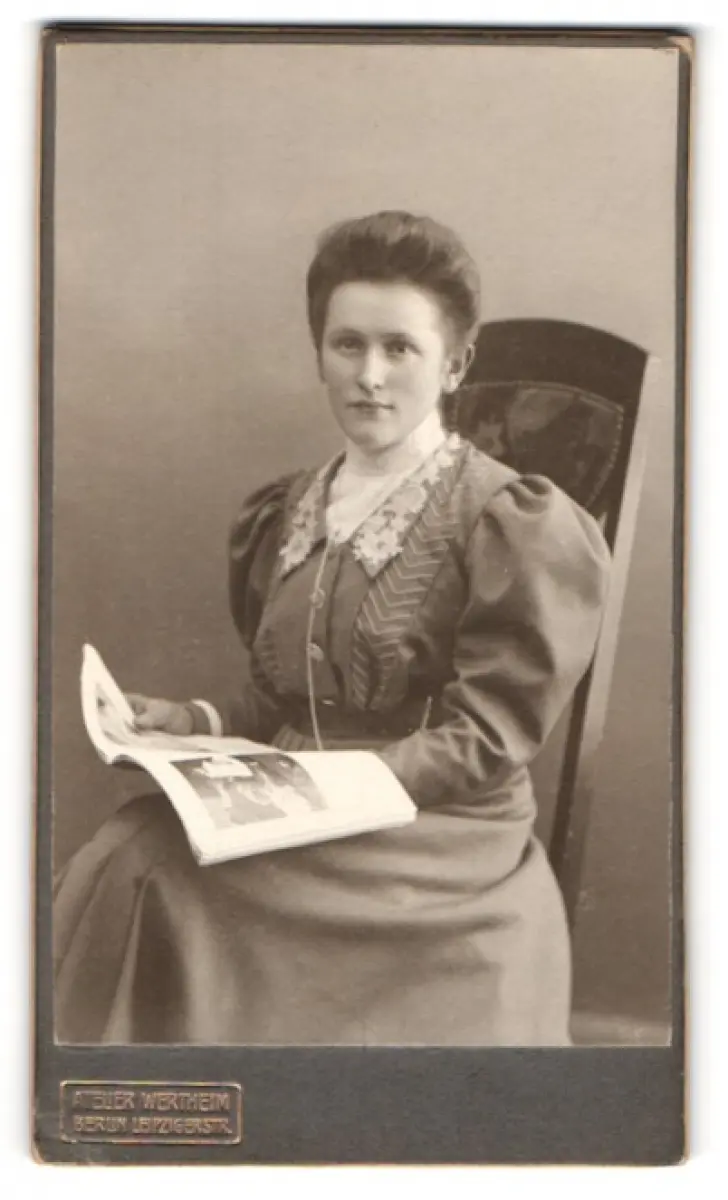Fotografie Atelier Wertheim, Berlin, Leipzigerstr., Dame mit Buch in elegantem Kleid