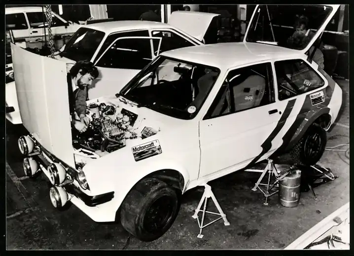 Fotografie Auto Ford Fiesta, Rallye Rennwagen in einer Werkstatt
