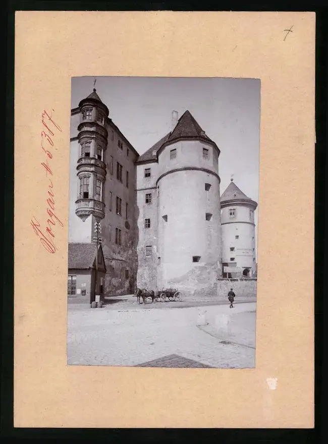 Fotografie Brück & Sohn Meissen, Ansicht Torgau, Pferdefuhrwerk am Schloss