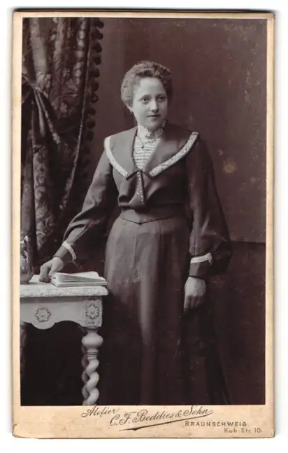 Auf dieser eindrucksvollen CDV Fotografie ist eine Dame in einem eleganten Kleid zu sehen, die anmutig neben einem verzierten Tisch steht. Der Hintergrund wird von einem schweren, gemusterten Vorhang geziert, der dem Bild eine zusätzliche Dimension verleiht. Die Dame blickt mit nachdenklichem Ausdruck zur Seite, während ihre Hand auf einem Buch ruht. Ihre Frisur ist sorgfältig hochgesteckt, was den formellen Charakter der Aufnahme unterstreicht., guter Zustand Größe ca. 6,5 x 10,5cm