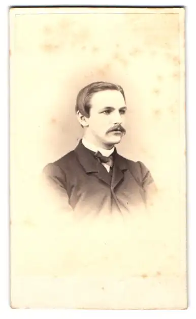 Diese Carte de Visite zeigt das Porträt eines jungen Mannes mit Schnurrbart. Er trägt einen dunklen Anzug und ein weißes Hemd mit Kragen. Sein Haar ist gepflegt und zur Seite gekämmt. Die Fotografie ist sorgfältig inszeniert und betont die Gesichtszüge des Mannes., leicht fleckig, guter Zustand