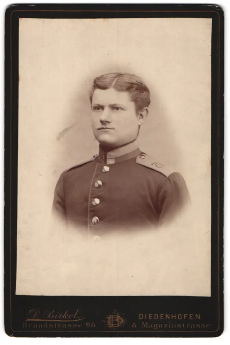 Diese Kabinett Fotografie zeigt einen jungen Soldaten in einer formellen Uniform. Seine Haltung ist aufrecht und sein Ausdruck entschlossen. Die Uniform ist mit glänzenden Knöpfen verziert, die im Kontrast zum matten Stoff stehen. Der Hintergrund ist schlicht gehalten, wodurch der Fokus auf die markante Erscheinung des Soldaten gelenkt wird., guter Zustand