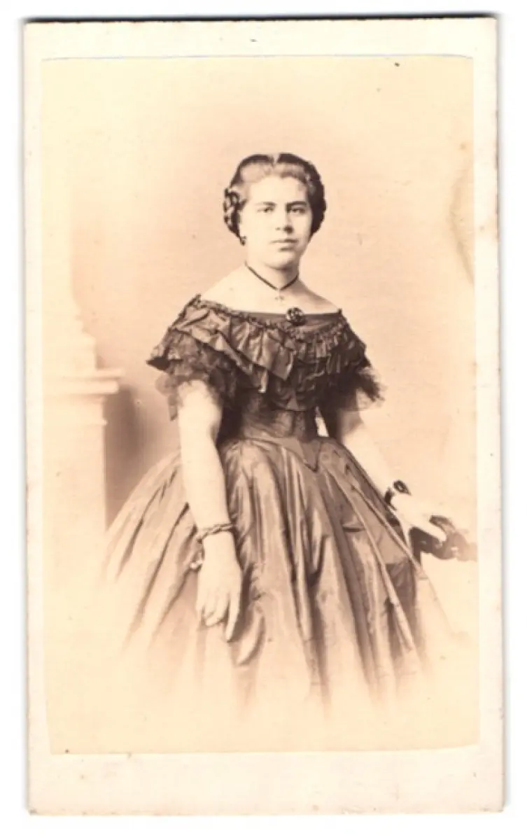 Fotografie Ed. Radtke, Berlin, Dame im schulterfreien Kleid mit Brosche