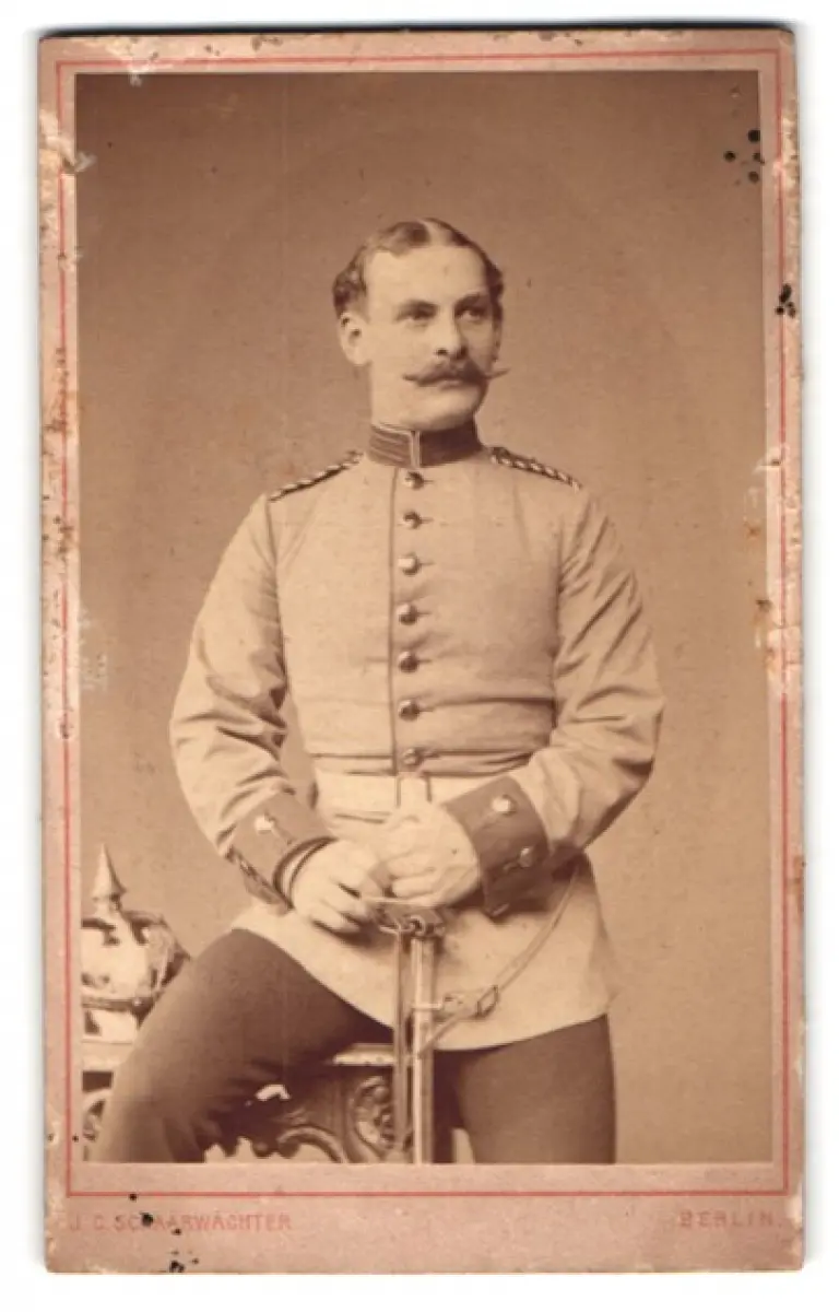 Fotografie J. C. Schaarwächter, Berlin, Friedrich-Str. 190, Einjährig-Freiwilliger Gardesoldat in Uniform mit Säbel
