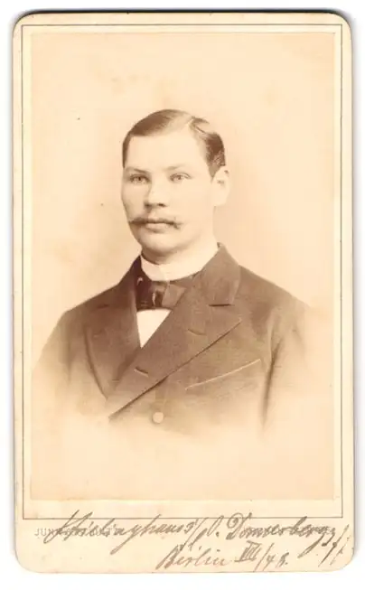 Diese CDV Fotografie zeigt das fein ausgearbeitete Portrait eines eleganten Herren. Der Mann trägt einen gut sitzenden Anzug mit einem ordentlichen Hemd und einer stilvollen Schleife. Sein Haar ist ordentlich gescheitelt, und ein gepflegter Schnurrbart ziert sein Gesicht. Die dezente Sepia-Tönung verleiht dem Bild eine zeitlose Eleganz und lässt die Details des Anzugs und der Gesichtszüge sanft hervortreten., guter Zustand Größe ca. 6,5 x 10,5cm