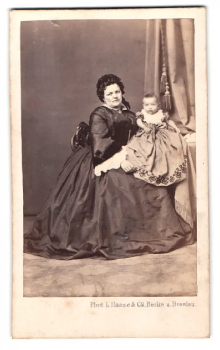 Diese erlesene CDV Fotografie zeigt eine eindrucksvolle Dame in vornehmer Aufmachung, die ein kleines Kind behutsam auf ihrem Schoß trägt. Die Szenerie wirkt würdevoll und durchdacht, mit einem schweren Vorhang im Hintergrund, der der Komposition eine zusätzliche Tiefe verleiht. Das Kind ist in ein aufwendig verziertes Kleid gehüllt, das liebevoll bestickt ist und seinen fragilen Charme unterstreicht. Die Dame trägt ein elegantes Kleid, welches den Stil und die Mode jener Epoche eindrucksvoll widerspiegelt., guter Zustand Größe ca. 6,5 x 10,5cm