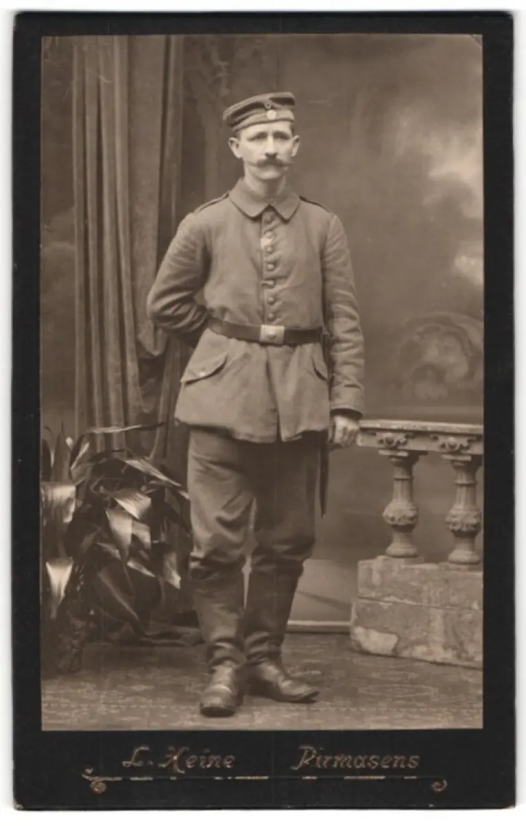 Diese CDV Fotografie zeigt einen ernst dreinblickenden Soldaten in seiner Uniform aus vergangenen Zeiten. Er steht aufrecht neben einer kunstvoll verzierten Balustrade, die den Blick auf eine inszenierte Kulisse lenkt. Der Hintergrund wird von einem schweren Vorhang und einer Topfpflanze ergänzt, die dem Bild eine gewisse Tiefe verleihen., guter Zustand Größe ca. 8,5 x 13,5cm