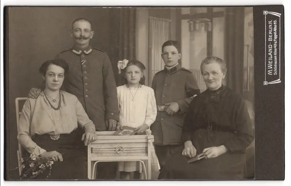 Fotografie M. Weiland, Berlin, Uffz. in Uniform nebst Familie, Sohn in Uniform mit Trauerflor, Kriegsausmarsch