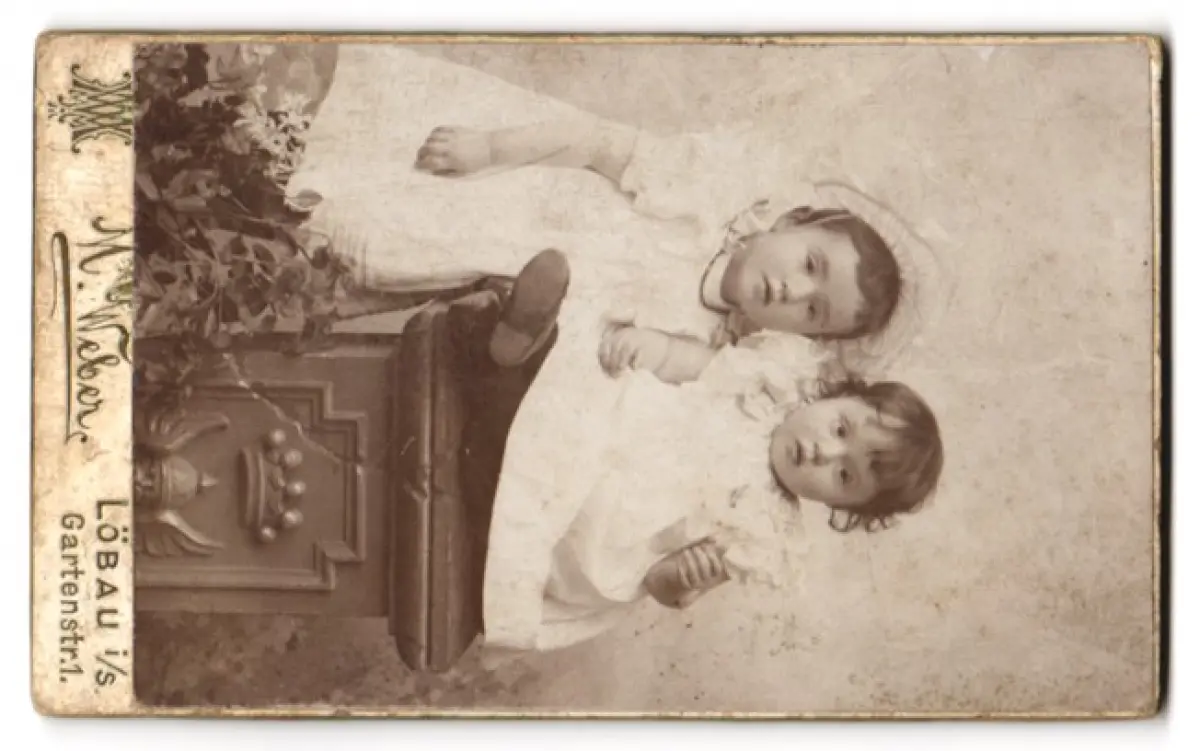 Diese CDV Fotografie zeigt ein zartes Arrangement zweier kleiner Kinder, die in eleganter Kleidung mit feinen Details posieren. Die Kinder sind nebeneinander platziert, der eine hält sanft die Hand des anderen. Im Hintergrund sieht man dezente florale Akzente, die dem Bild eine zusätzliche Tiefe verleihen. Die Komposition strahlt eine zeitlose Ruhe und Anmut aus., guter Zustand Größe ca. 10,5 x 6,5cm