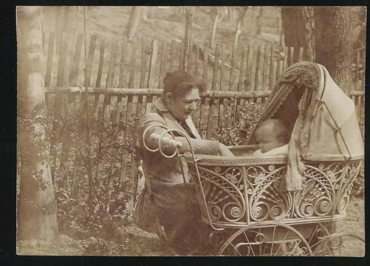 Fotografie Mutter mit ihrem Kind in verzierten Kinderwagen