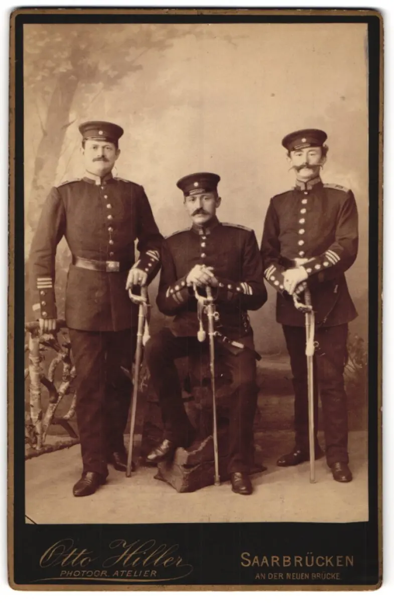 Fotografie Otto Hiller, Saarbrücken, An der neuen Brücke, Drei Uffz. in Uniform Rgt. 70 mit Säbel