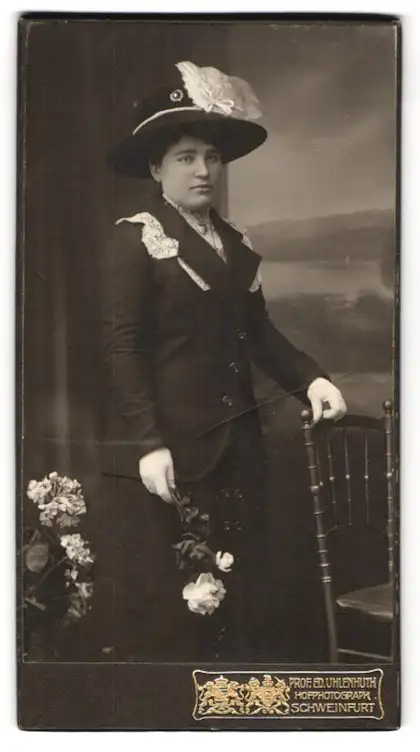 Fotografie Prof. Ed. Uhlenhuth, Schweinfurt, Dame im dunklen Kleid mit Rüschenbesatz und Hut