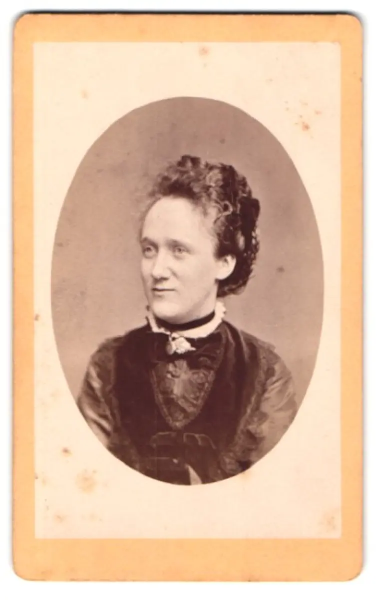 Dieses eindrucksvolle CDV-Fotoporträt zeigt eine Dame von besonderer Anmut. Ihr Haar ist kunstvoll frisiert und ein dezentes Lächeln umspielt ihre Lippen. Der Blick ist sanft zur Seite gerichtet, was dem Bild eine ruhige und doch eindringliche Ausstrahlung verleiht. Das dunkle, elegant geschnittene Kleid mit feinen Details unterstreicht ihre vornehme Erscheinung. Die Fotografie fängt nicht nur das äußere Erscheinungsbild, sondern auch den zeitlosen Charakter der abgebildeten Person ein., guter Zustand Größe ca. 6,5 x 10,0cm