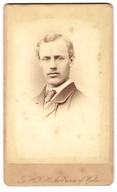 Diese CDV Fotografie zeigt das eindringliche Porträt eines jungen Mannes. Sein Blick ist ruhig und selbstbewusst, während er mit feinem Anzug und Krawatte dem Betrachter entgegenblickt. Die sanfte Beleuchtung und der dezente Hintergrund lenken die Aufmerksamkeit auf seine markanten Gesichtszüge und die sorgfältig gestylte Frisur. Ein zeitloses Abbild, das die Eleganz und den Stil der Epoche einfängt., guter Zustand