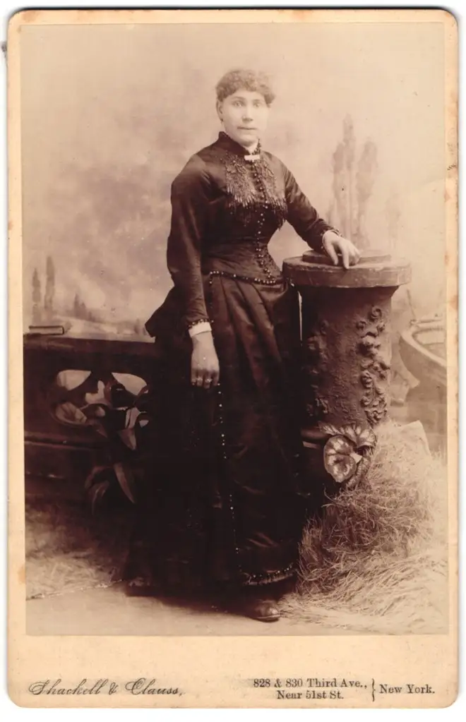 Fotografie Schackell & Clauss, New York, 828 & 830 Thrid Ave., Junge Dame im bestickten Kleid