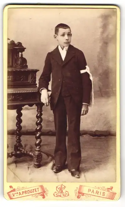 Diese CDV Fotografie zeigt einen Jungen, der in einem eleganten, dunklen Anzug gekleidet ist. Er steht neben einem kunstvoll verzierten Tisch und trägt ein weißes Band am Arm, was möglicherweise auf eine besondere Gelegenheit oder Zeremonie hinweist. Sein Blick ist ernst und aufmerksam, während er mit einer Hand leicht auf dem Tisch ruht. Der Hintergrund ist schlicht, was den Fokus auf die Person lenkt und die Details der Kleidung und des Mobiliars hervorhebt., guter Zustand Größe ca. 6,5 x 11,0cm
