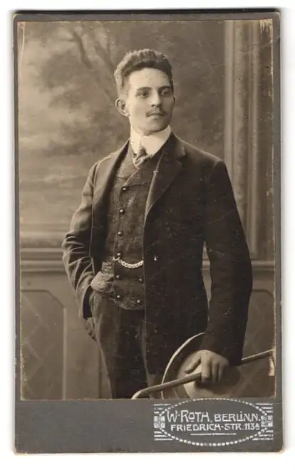 Fotografie W. Roth, Berlin, Friedrich-Strasse 113a, Eleganter Herr mit Hut im Atelier.