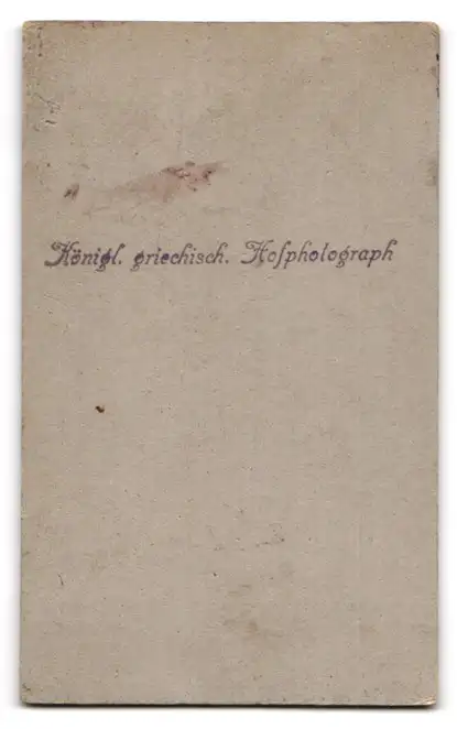 Die Fotografie zeigt einen jungen Herrn in einem edlen Anzug, der selbstbewusst und lässig in die Kamera blickt. Er trägt eine Weste mit einer Kette und hält einen Hut in der Hand, was seiner Erscheinung eine zusätzliche Note von Stil und Raffinesse verleiht. Der Hintergrund des Ateliers ist kunstvoll gestaltet und unterstreicht die Eleganz des Motivs. Stempel auf der Rückseite: "Königl. griechisch. Hofphotograph.", guter Zustand Größe ca. 6,5 x 11,0cm