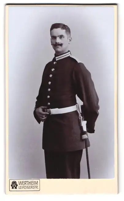Fotografie Wertheim, Berlin, Leipzigerstr., Soldat in Garde Uniform mit Bajonett und Portepee