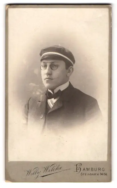 Fotografie Willy Wilcke, Hamburg, Steindamm 54 /56, Student im Anzug mit Couleur und Zwickerbrille