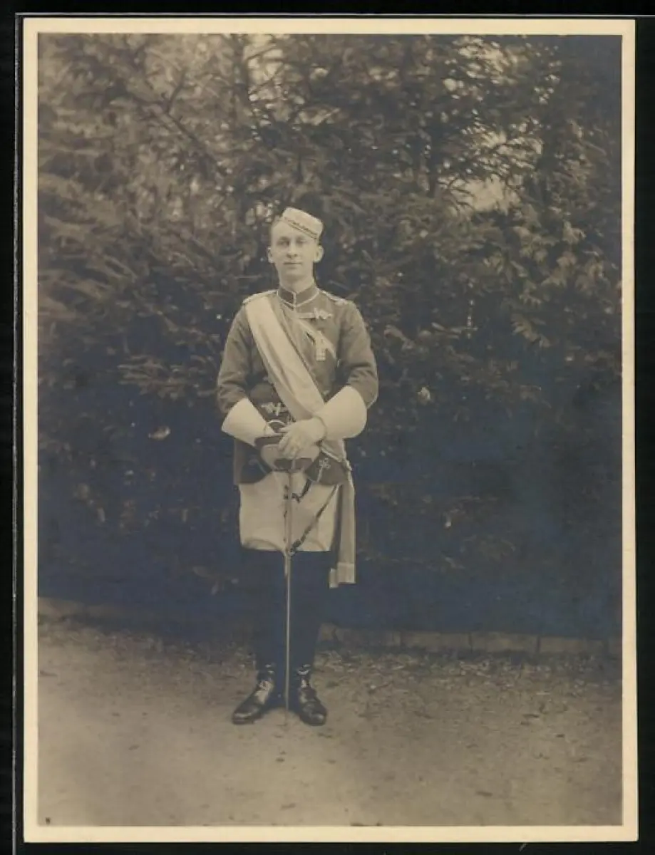 Fotografie junger Student im vollen Wichs mit Schläger und Biertönnchen