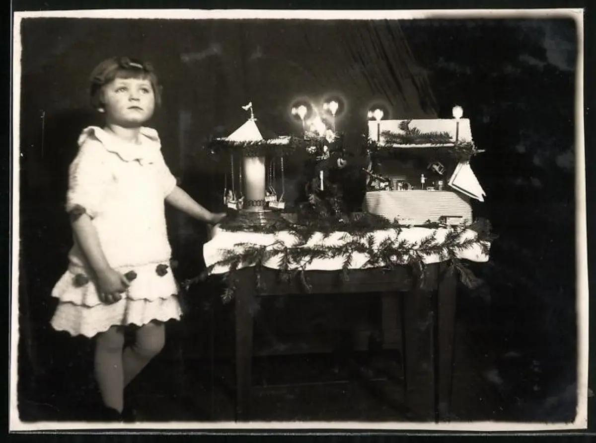 Fotografie kleines Mädchen bekommt zu Weihnachen Miniatur Karussell und Figuren