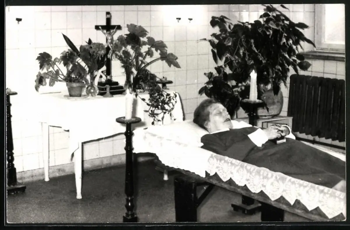 Fotografie tote ältere Frau im Leichenschauhaus aufgebahrt, Post mortem