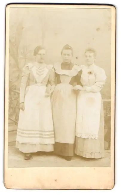 Fotografie unbekannter Fotograf und Ort, Drei junge Frauen in Schürzen