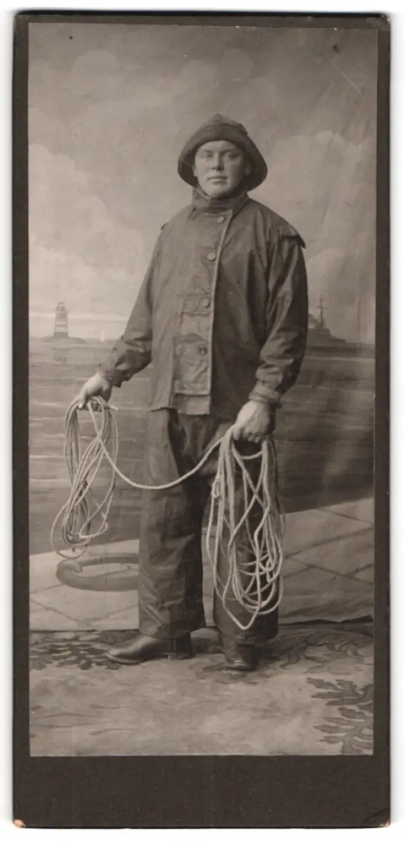 Fotografie unbekannter Fotograf und Ort, Fischer in Ölzeug mit Seil in der Hand vor einer Studiokulisse