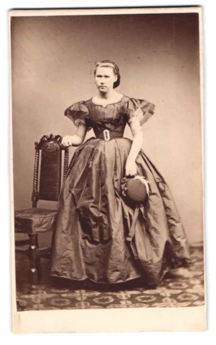 Diese CDV Fotografie offenbart das Bildnis einer jungen Frau, die in einem prachtvollen, voluminösen Kleid aus der Epoche posiert. Ihre Pose ist formell und anmutig, während sie eine Hand sanft auf die Lehne eines kunstvoll gestalteten Stuhls legt. Ihre Frisur ist schlicht und ergänzt den eleganten Gesamteindruck. Der Boden ist mit einem dekorativen Muster versehen, das dem Setting eine zusätzliche Note von Raffinesse verleiht., guter Zustand