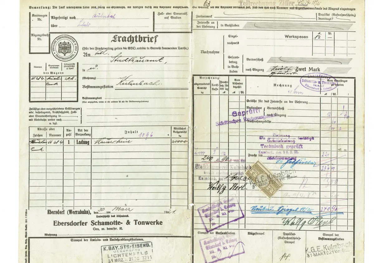 Frachtbrief 1921 Ebersdorf WERRABAHN EISENBAHNDIREKTION CÖLN Mauersteine #71Nr.2. Als Zustandsbeschreibung dient der Scan von Vorder- und Rückseite mit 300DPI-Qualität. Das originale Dokument kann aufgrund der Glättung beim Scan hier nicht sichtbare Risse / Einrisse / Abrisse aufweisen und aufgrund der Größe gegebenenfalls nicht in Gänze abgescannt worden sein.Fragen werden gerne beantwortet.dewabit