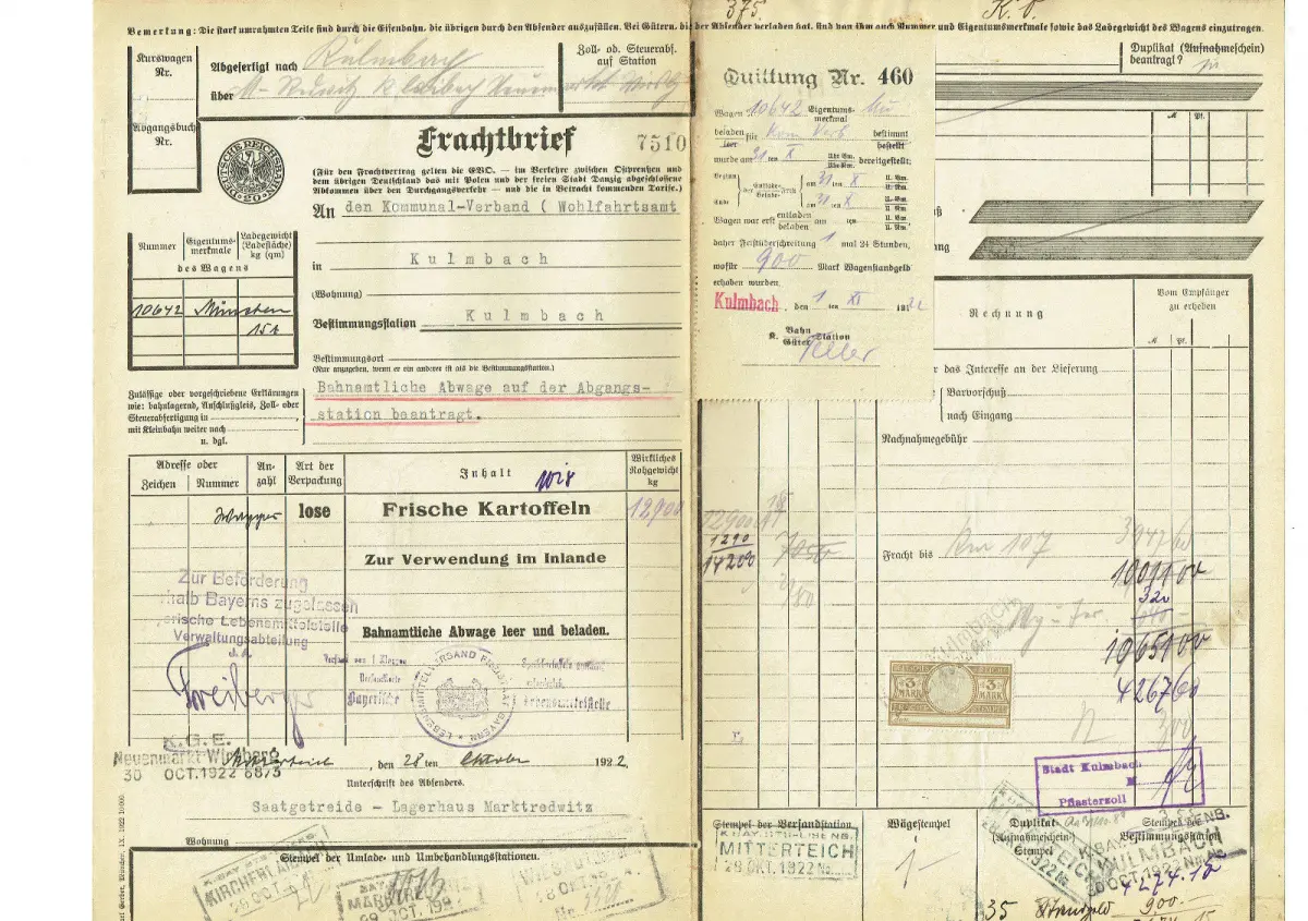 Frachtbrief 1922 MARKTREDWITZ Hungersnot Kartoffeln mit Quittung #48