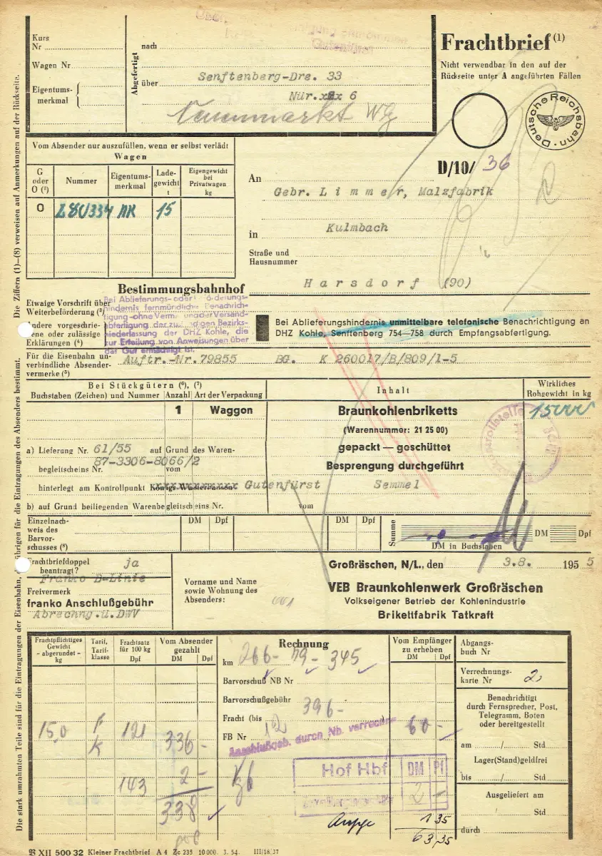 Frachtbrief DDR 1955 VEB BRAUNKOHLENWERK GROßRÄßCHEN HARSDORF #118