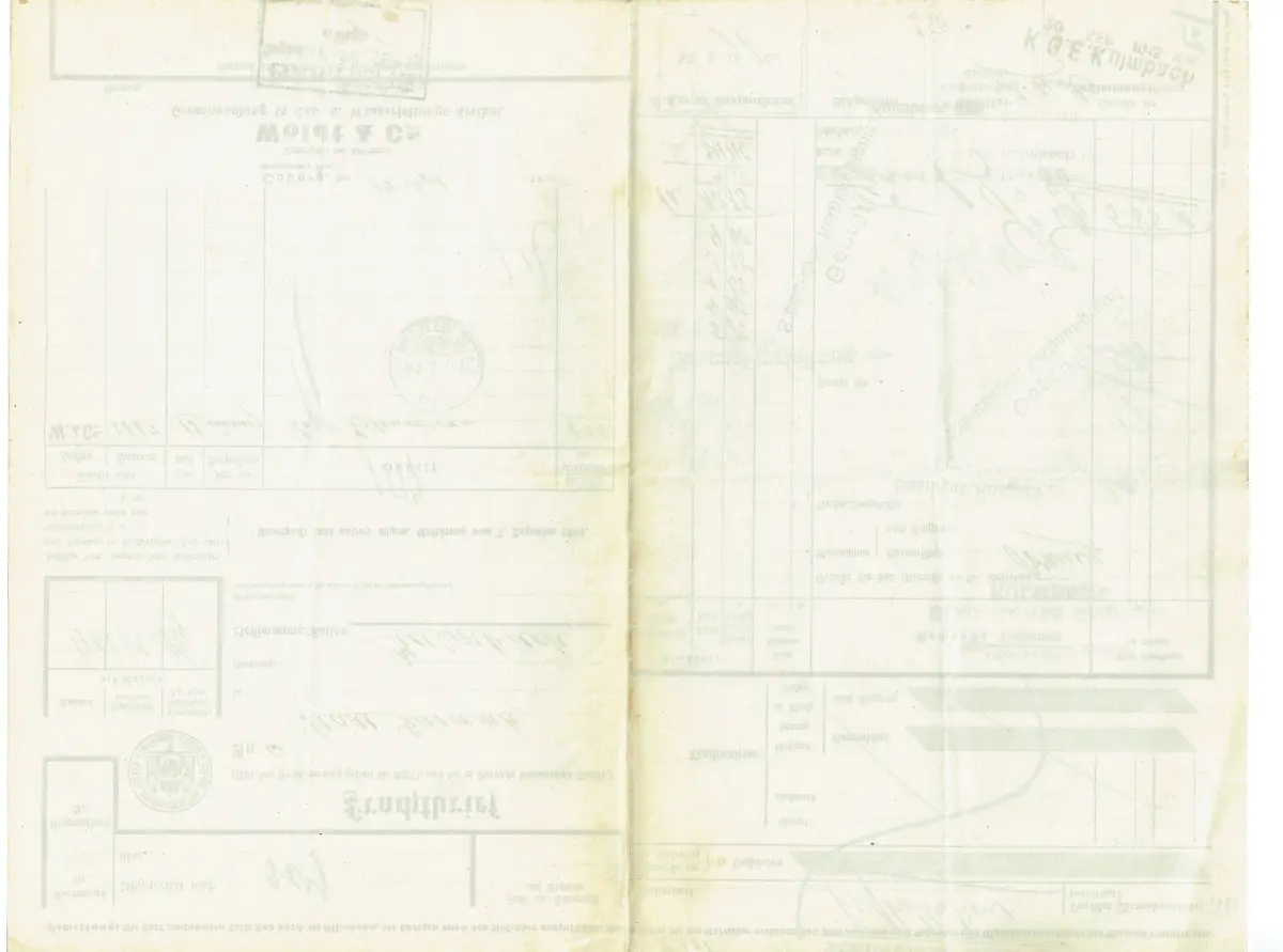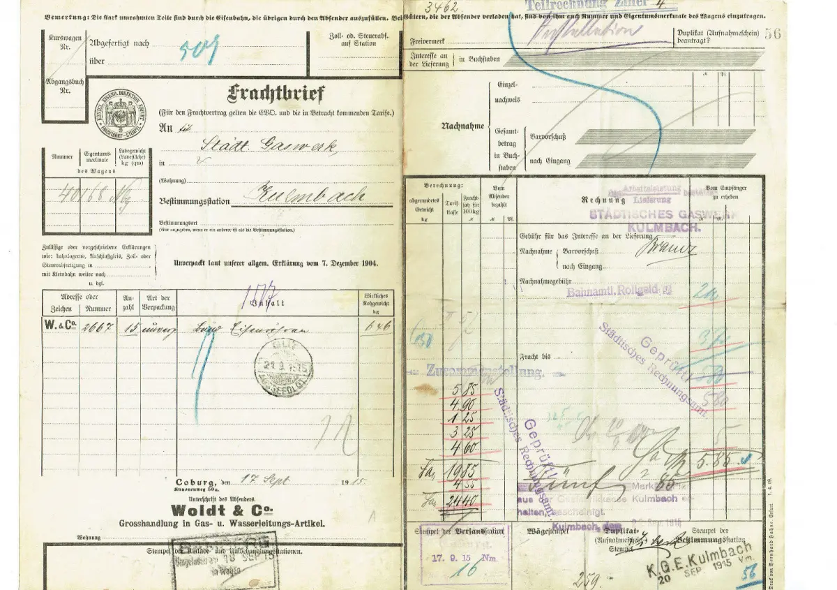 Frachtbrief Kgl. Eisenbahn Dir. Erfurt 1915 1. Weltkrieg nach Kulmbach. Größe: etwa DIN A3Der Zustand ist den Scans (300 Dpi) zu entnehmen.dewabit