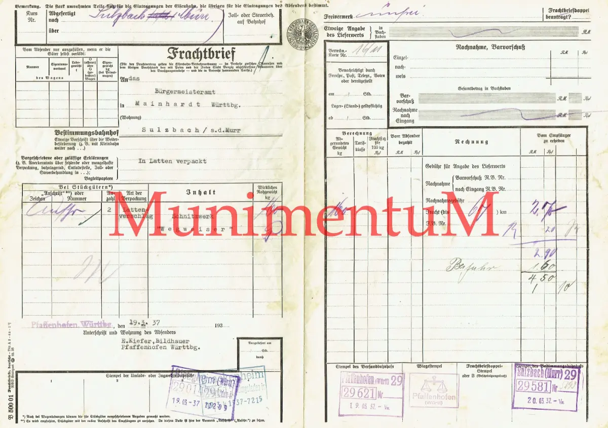 Frachtbrief PFAFFENHOFEN Bildhauer E. Kiefer 1937 Schnitzwerk Wegweiser SULZBACH