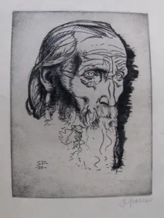 Titel: BILDNIS ÄLTERER MANN MIT BART - SEPP FRANK *. ORIGINAL-RADIERUNG: Bildnis Alter Mann mit Bart - (v. Profil - Halbrechts-Seite). Signiert mit Bleistift unten rechts. Monogr. SF u. 20 (für Jahrg.) im Druck