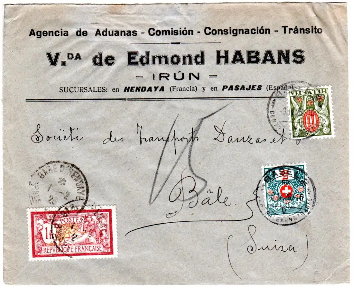 Ungenügend frankierter Spanien Firmenbrief E. Habans m. Frankreich 1 Fr. u. Stempel Gare D'Hendaye nach Basel mit Schweiz Portomarken Mischfrankatur 5+10 C.