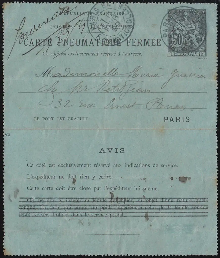 Frankreich Rohrpost-Kartenbrief RK 15I dicke Striche, PARIS 1899, gefaltet