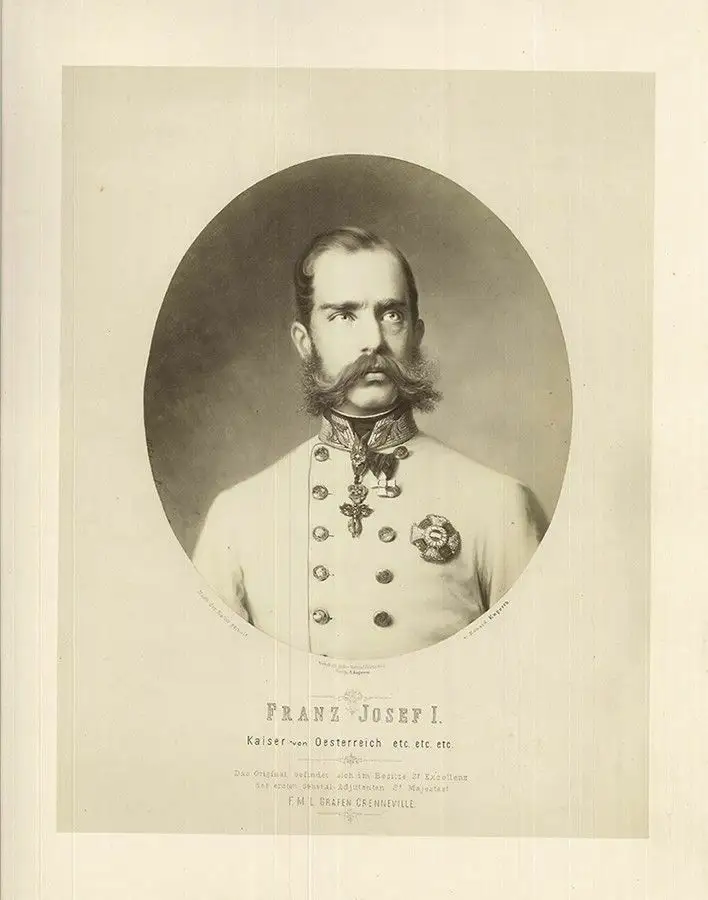 Bemerkungen: Photographischer Lichtdruck aus dem Atelier des Hofphotographen Ludwig Angerer (1827-1879) nach einem Gemälde des österreichischen Malers Eduard von Engerth (1818-1897). Zu sehen ist Kaiser Franz Joseph als Brustfigur in deutscher Feldmarschall-Galauniform. Mit dem gedruckten Vermerk: "Das Original befindet sich im Besitze Sr. Excellenz des ersten General-Adjudanten Sr. Majestaet F. M. L. Grafen Crenneville".