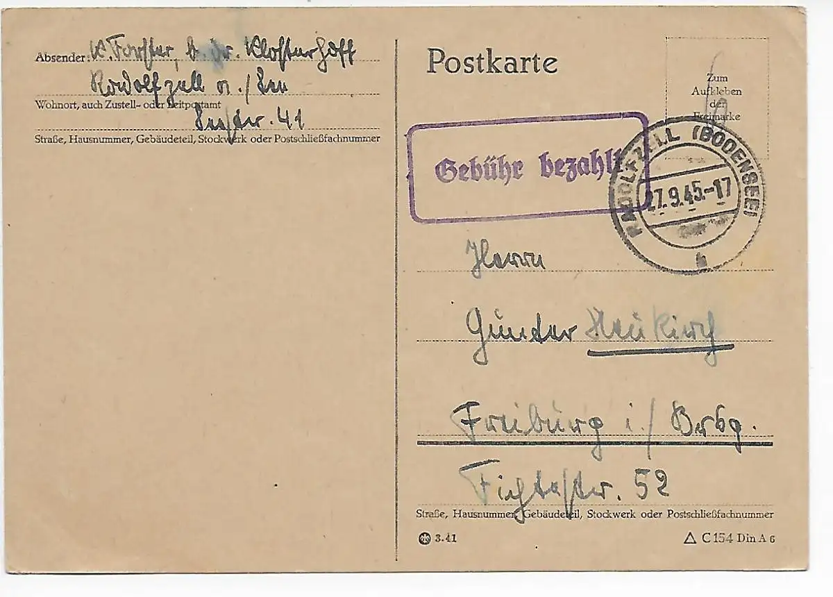 Franz Zone:Gebühr bezahlt, Radolfzell 1945 nach Freiburg