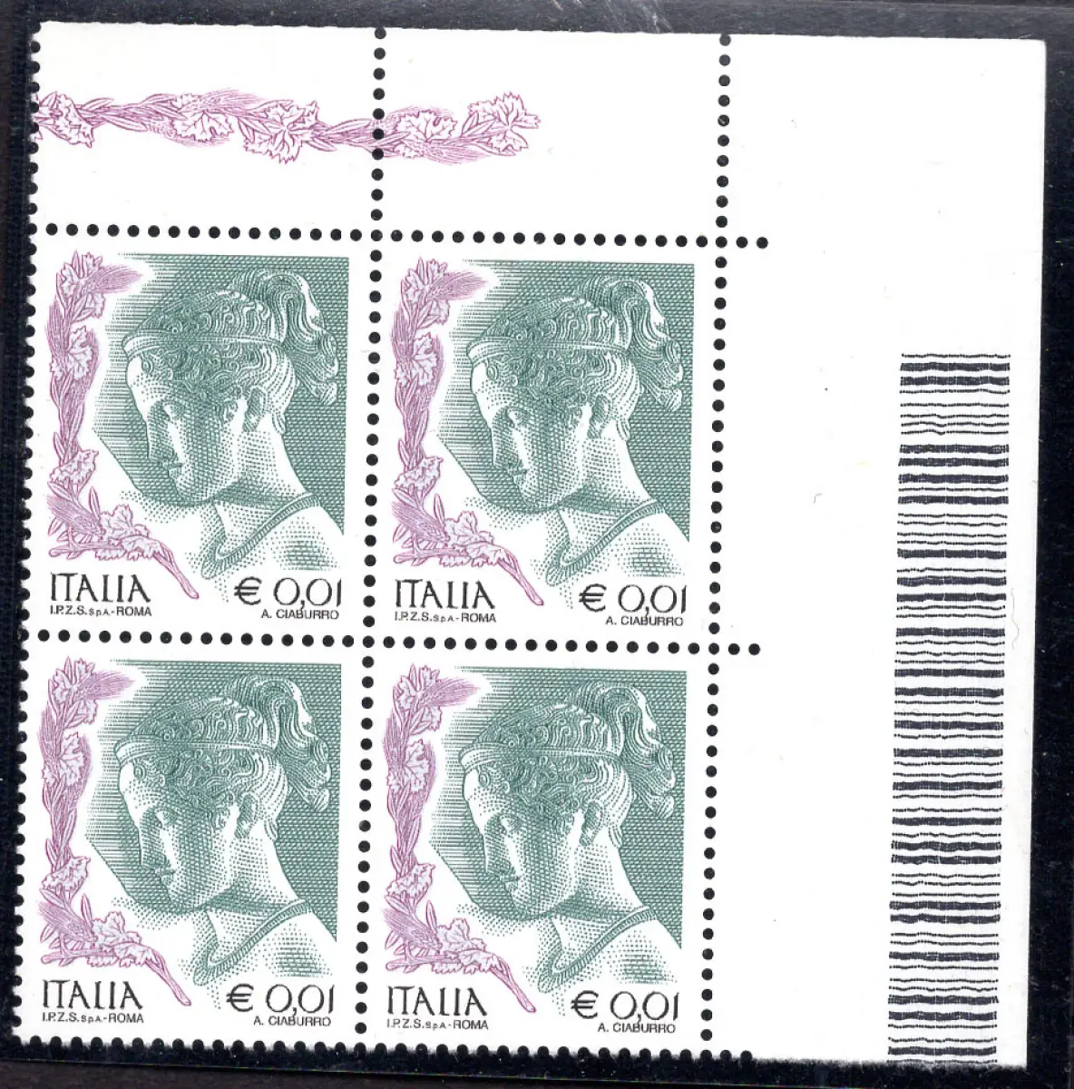 MNH - Vollgummi - Frau in der Kunst Euro 0,01 Nr. 2721 Viertel a. von f. gedruckt auf nicht fluoreszierendem Papier (Sass. spec. n. 2363Ca) - Ungewöhnlich - Kat. euro 100 Cod. 932/17