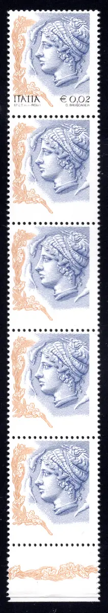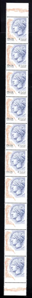 MHN Vollgummi - Frauen in der Kunst Euro 0,02 (S.p.A.) - Vertikaler Streifen von zehn Exemplaren (mittig auf der Zahnung gefaltet) alle ohne Gold-Interferenzdruck, die ersten sechs Exemplare haben die anderen Farben, während die unteren vier Briefmarken ohne Schwarzdruck sind - Selten Cod 1709/WEB