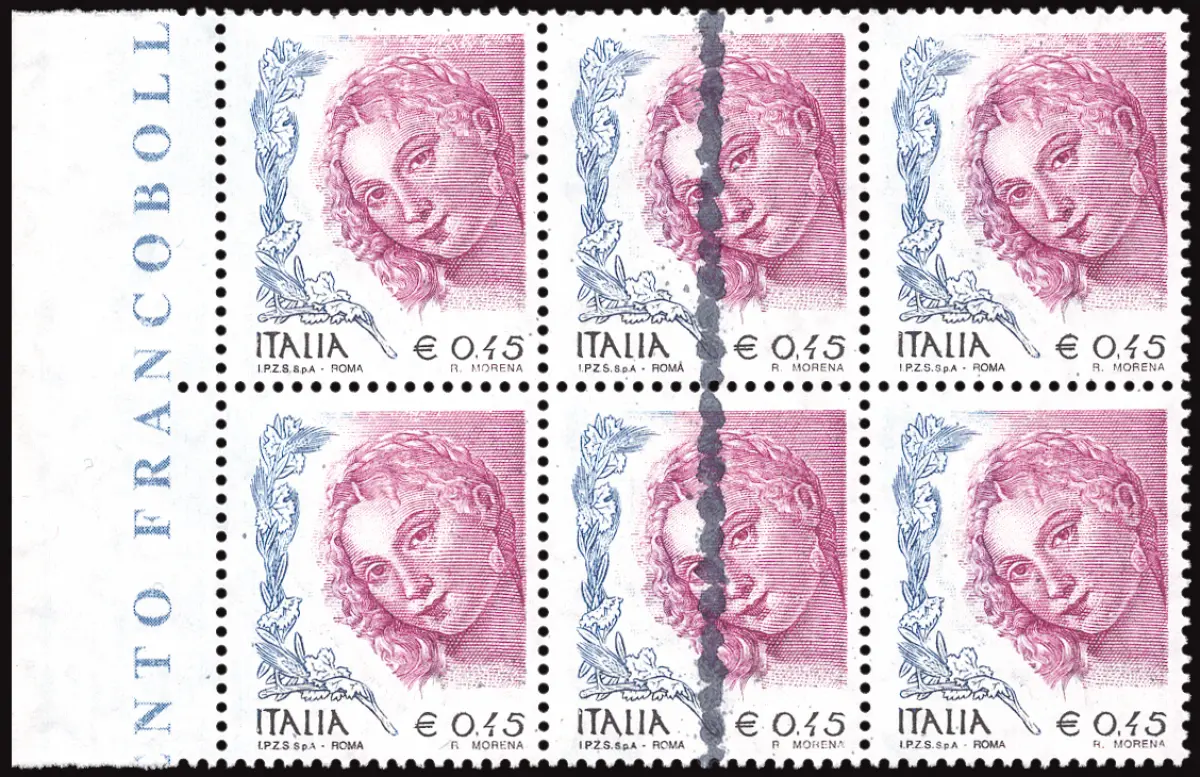 MNH - Vollgummi - Frau in der Kunst Euro 0,45 Nr. 2726 Sechserblock b. von f., das Exemplar in der Mitte mit schwarzen Kreisstreifen, die normalerweise auf Fehlfunktionen oder Druckanomalie hinweisen - auffällige gelegentliche Sorte Cod. 937/17