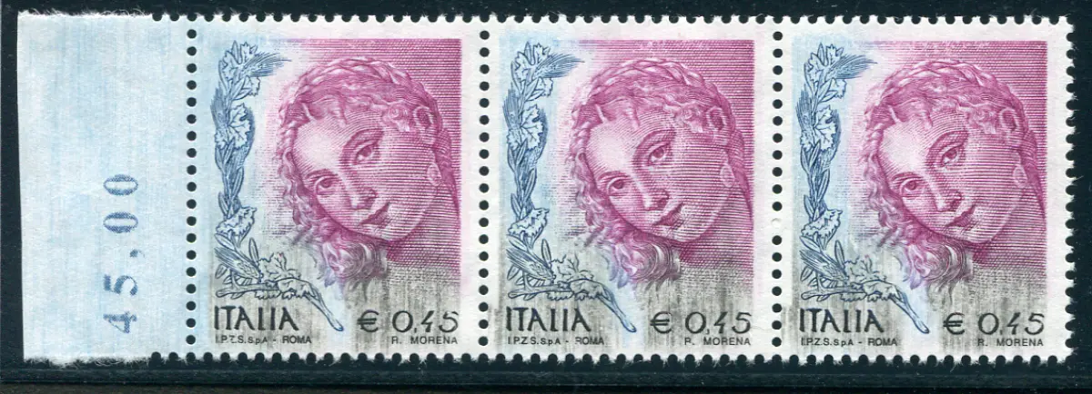 Frau in der Kunst Euro 0,45 Spa Sorte Druckinfiltrationen in Schwarz Vollgummi MNH - Frau in der Kunst Euro 0,45 Spa Nr. 2726 Dreistreifen b. von f. mit schwarzen Infiltrationen; es sieht so aus, als würde die Frau ein schwarzes Kleid tragen) - Nette Gelegenheitssorte Cod. 733/15