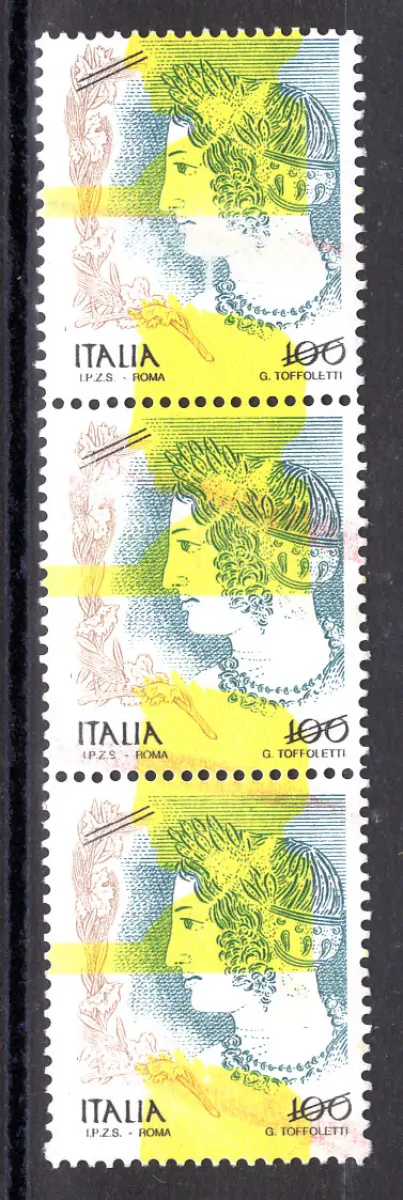 Frau in der Kunst Lire 100 - Dreifachstreifen Druckprobe Vollgummi - Frau in der Kunst Lire 100 - Dreifachstreifen Druckprobe in Schiefer und Gelb mit dem Wert 100 demonetarisiert durch zwei schwarze Striche - Der Druck des gelben Hintergrunds ist stark vertikal verschoben (Kat. Sassone spec. Nr. P 85) - Gummimängel wie bei diesen Exemplaren üblich - Ungewöhnlicher Code 635/11